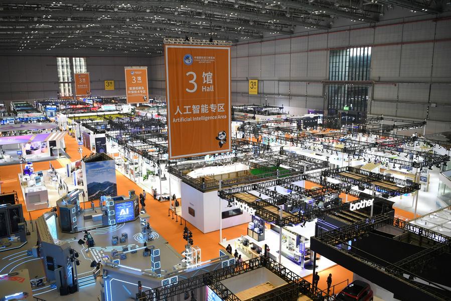 Exhibitors prepare for products display at the National Exhibition and Convention Center (Shanghai), the main venue for the 7th China International Import Expo (CIIE), in east China's Shanghai, Nov. 4, 2024. (Xinhua/Jin Mamengni)