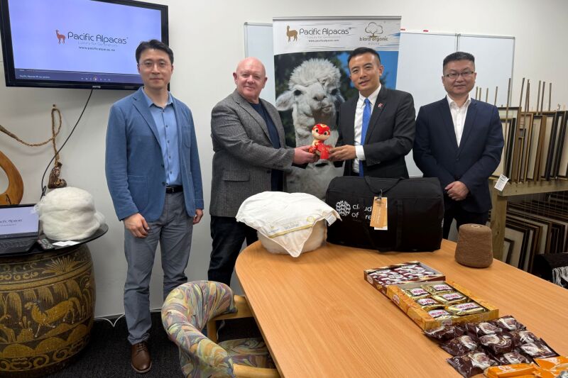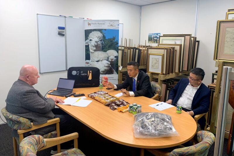 9月25日,驻奥克兰总领馆经商处主任王程光领事、果鹏文领事参访新西兰太平洋羊驼家纺集团(Pacific Alpacas),与公司首席执行官史蒂文·克罗、常务董事耿聪座谈。