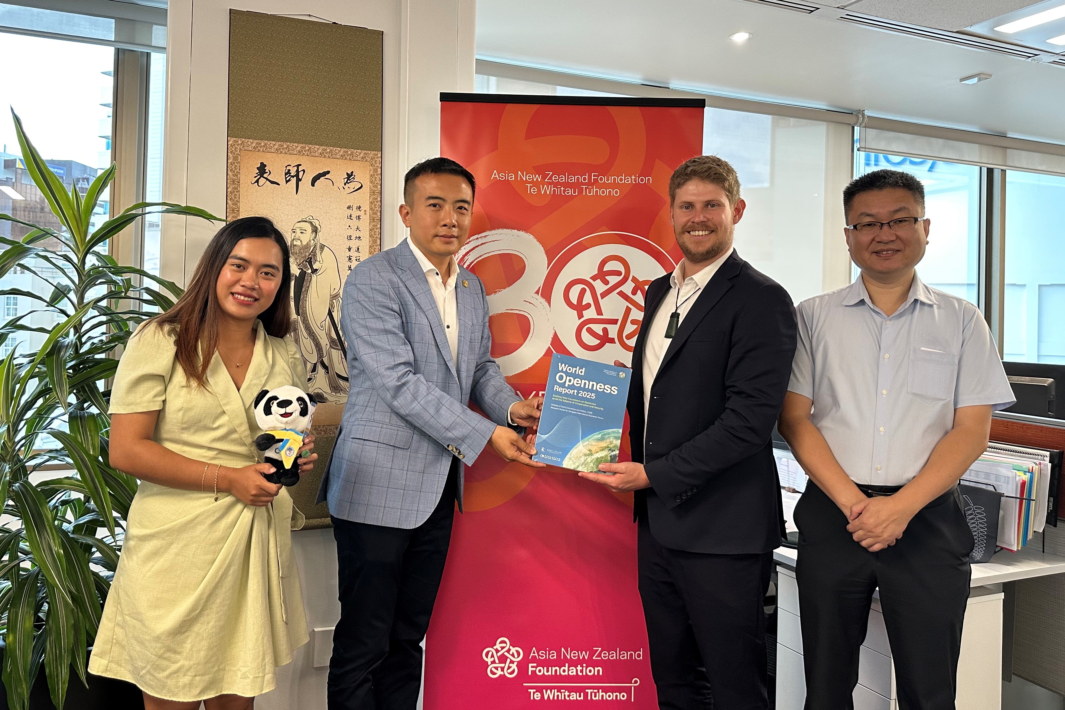 1月14日,驻奥克兰总领馆经商处主任王程光领事、果鹏文领事参访亚洲新西兰基金会(Asia New Zealand Foundation)奥克兰办公室,同商业项目经理李沛东、青年领导力顾问黎灵交流。