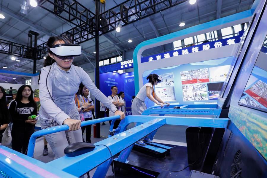 Visitors experience VR skiing during the 2025 China International Fair for Trade in Services (CIFTIS) in Beijing, capital of China, Sept. 10, 2025. (Xinhua/Chang Nengjia)