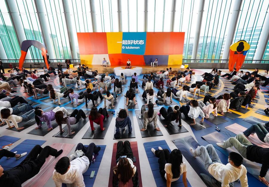 This photo shows a yoga event for one hundred participants organized by Lululemon outside the Consumer Goods Exhibition area during the eighth China International Import Expo (CIIE) in east China's Shanghai, Nov. 8, 2025. (Xinhua/Du Xinyi)
