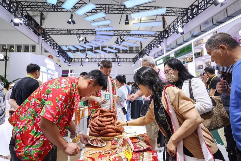 Visitors try specialties of Harbin at the 5th China International Consumer Products Expo (CICPE) in Haikou, south China's Hainan Province, April 16, 2025. (Xinhua/Zhang Liyun)