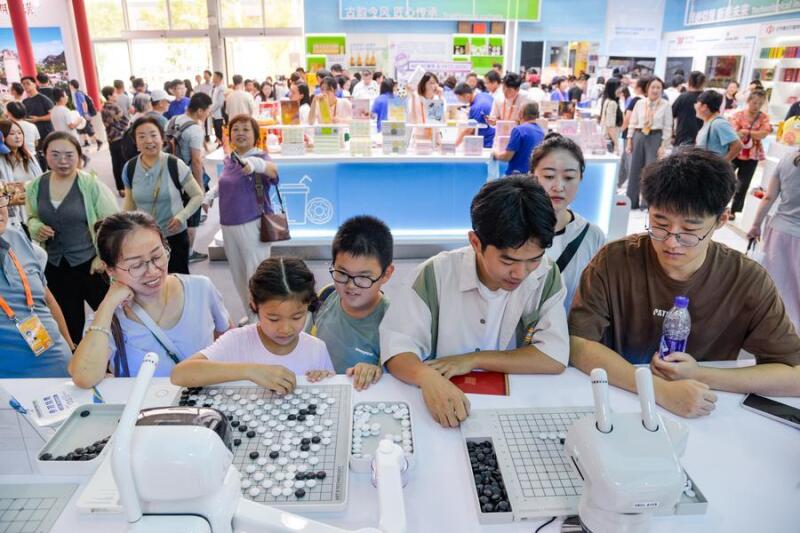 People play Go game, known as Weiqi in Chinese, with robots at the Cultural & Tourism Services exhibition area of the 2025 China International Fair for Trade in Services (CIFTIS) at Shougang Park in Beijing, capital of China, Sept. 13, 2025. (Xinhua/Xu Qin)