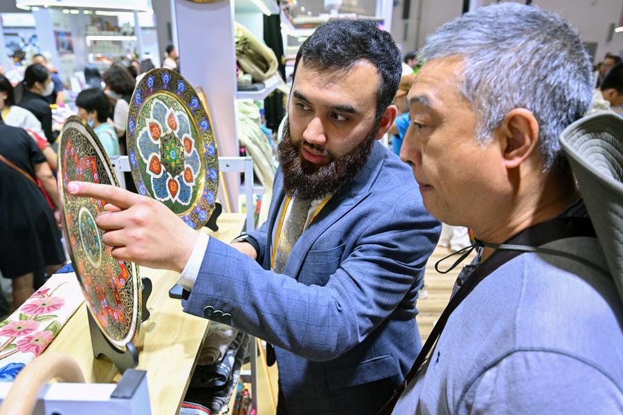 An exhibitor from Uzbekistan introduces products to a visitor at the 5th China International Consumer Products Expo (CICPE) in Haikou, south China's Hainan Province, April 17, 2025. (Xinhua/Guo Cheng)