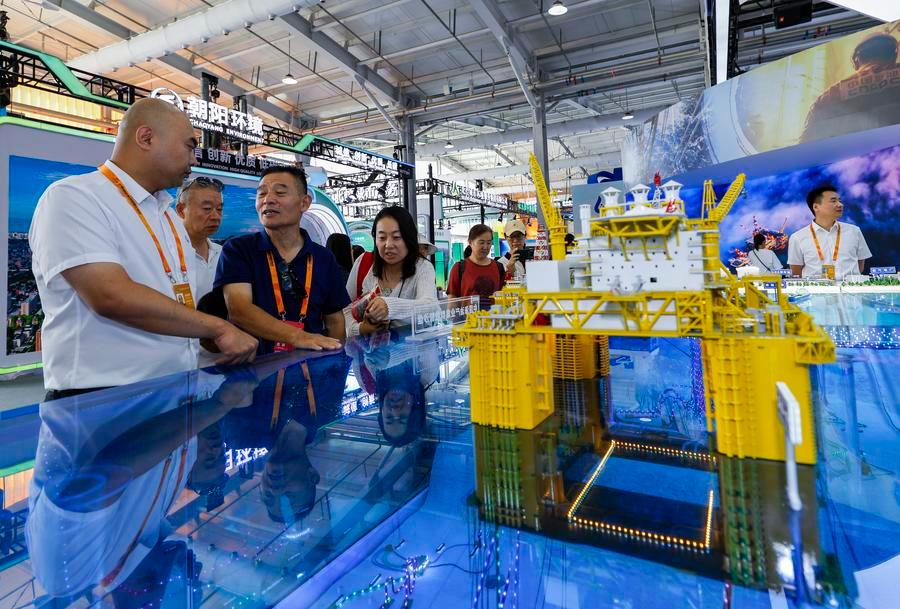 People view the models on the booth of China National Offshore Oil Corporation (CNOOC) at the Environmental Services exhibition area during the 2025 China International Fair for Trade in Services (CIFTIS) at Shougang Park in Beijing, capital of China, Sept. 14, 2025. (Xinhua/Chang Nengjia)