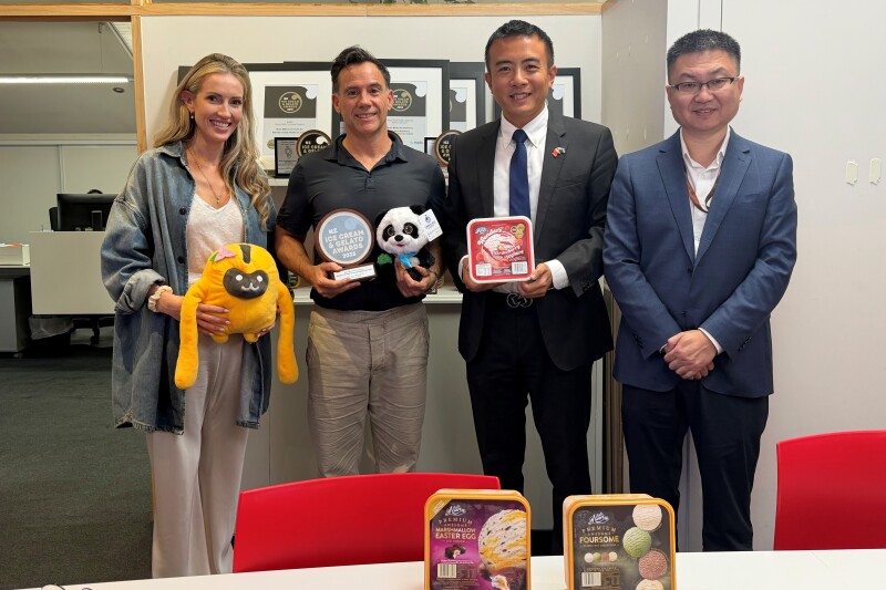 王程光向其赠送进博会和消博会吉祥物并表示,中国是新西兰冰淇淋最大出口市场,新西兰是中国冰淇淋第二大进口来源国。中国持续扩大高水平对外开放,欢迎更多新西兰食品企业利用进博会、消博会等国家级展会平台,共享“舌尖上”的“中国机遇”。