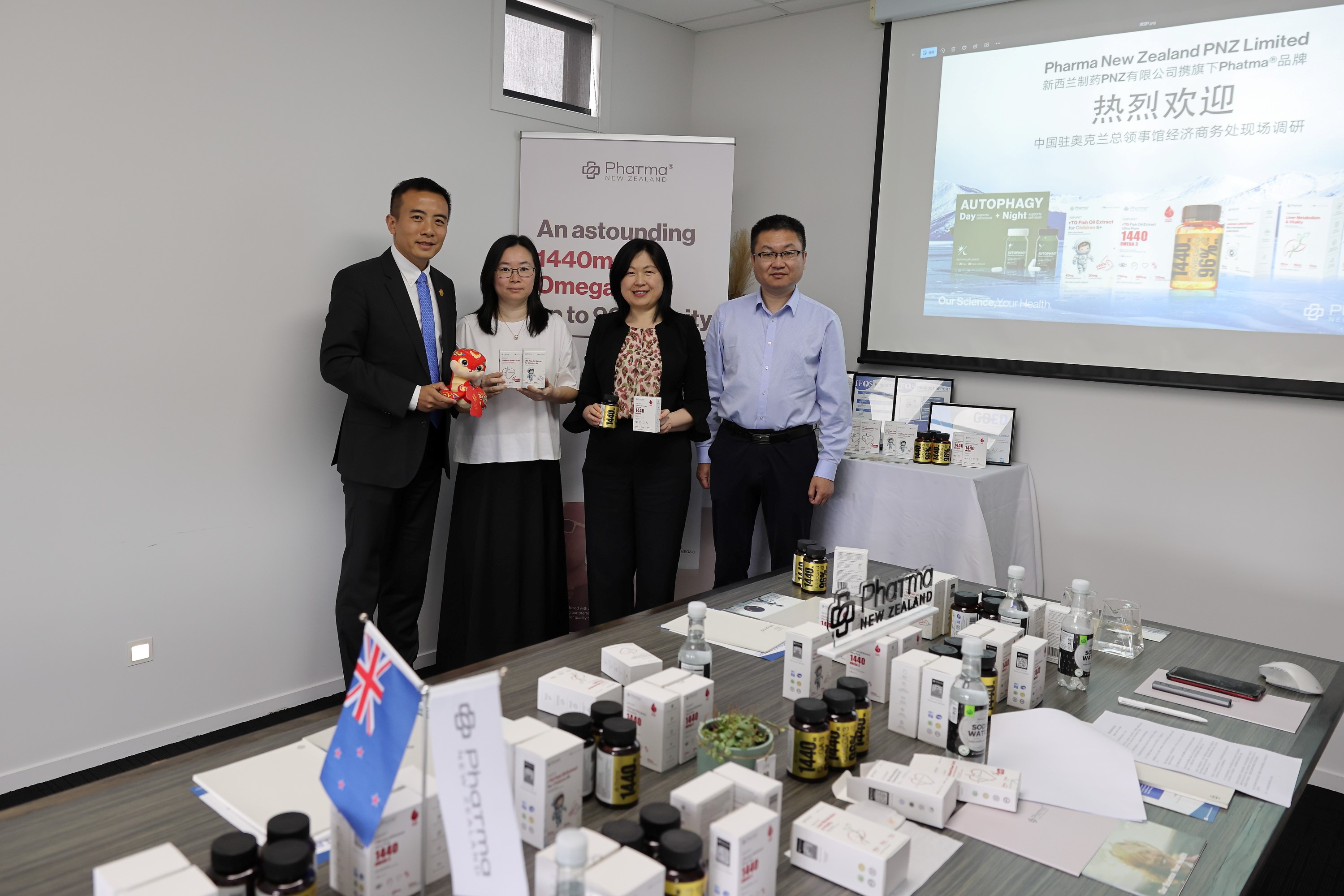 10月30日,驻奥克兰总领馆经商处主任王程光领事、果鹏文领事参访新西兰制药PNZ公司,与出口经理李颐、财务总监孙丹交流。